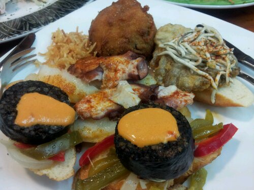 Blood sausage on peppers, Octopus a la plancha, Cod and Jamon Croquetta, and Fried mushroom with eel.