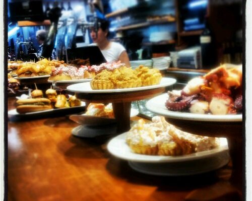I had to consciously squint to recover from the looney tune eye-pop and mental “A-Oooga!!” I experienced when I walked into the bar. Looking around the room in a hungry panic, I asked the tall Spanish man beside me if he spoke English. Thankfully he said yes and trained me in how to order, what to try first, and why it tastes better when you use your hands instead of utensils.