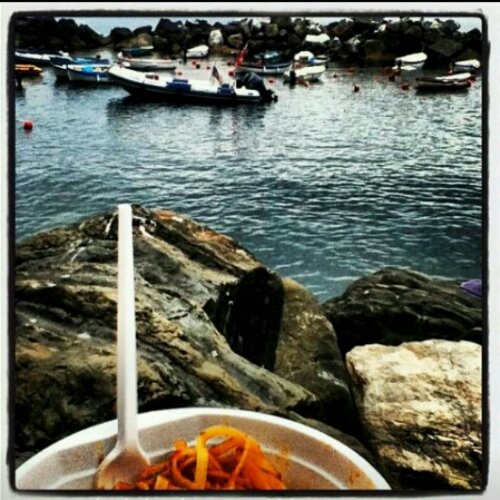 In most small Italian towns, you can find “Pasta To Go” shops around every cobblestone corner. You choose your pasta based on shape, (ie. Tagliatelle, Pappardelle, Gnocchi, Ravioli, etc.) then you choose pasta type, (spinach, wheat, herb). Finally, you select a sauce with numerous options varying from cream base, tomato or pesto, each with meat additions like beef, pork or prawns. I tried to avoid pasta in general, but this was absolutely wonderful and well worth the carb load before my huge hike in Cinque Terre.