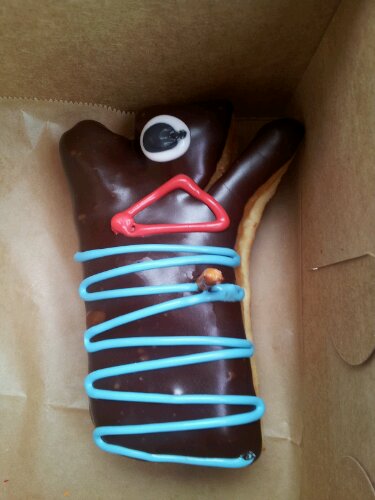 Overwhelmed with decisions and confusion, I went with the namesake: The Voo Doo Doughnut. You know, the one glazed in remorse and filled with raspberry regret. Also, it had a pretzel through its heart. I had to eat it. I had to.